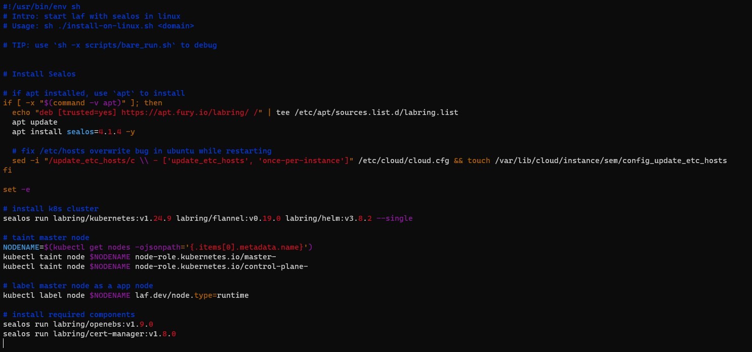 修改laf/deploy/scripts部署脚本,保留安装Sealos与初始化的内容,并且重命名为init_k8s.sh