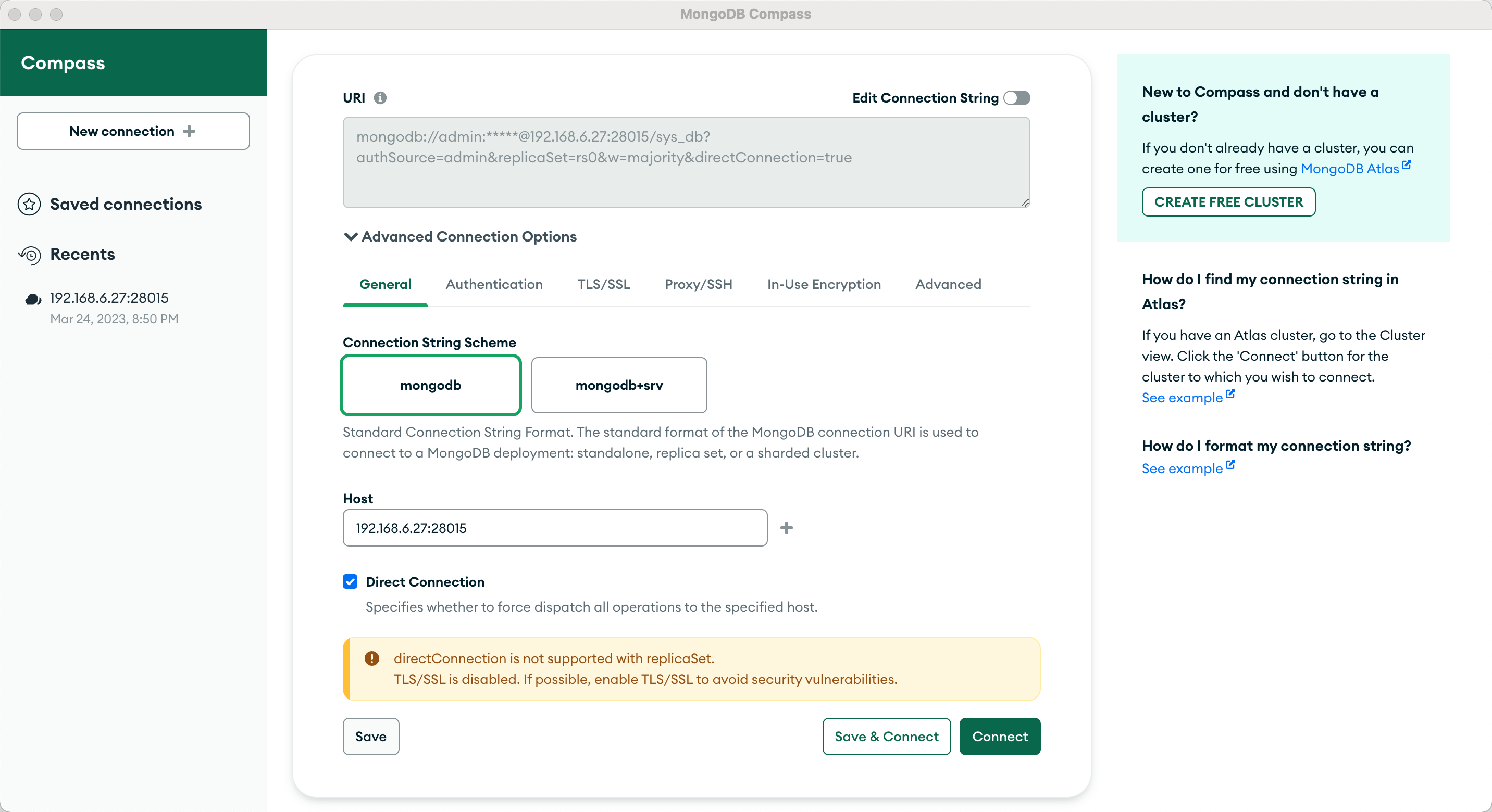 mongodb://admin:{替换为自己的密码}@192.168.6.27:28015/sys_db?authSource=admin&replicaSet=rs0&w=majority